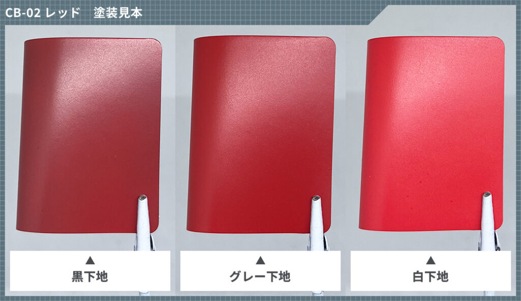 左から黒下地、グレー下地、白下地の順での塗装イメージになります。