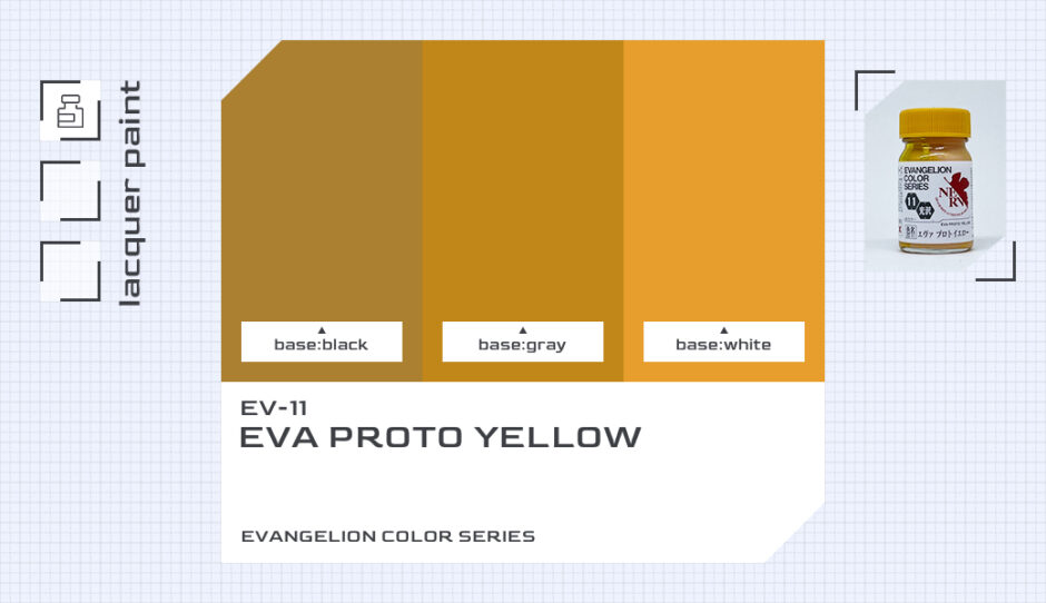 ガイアノーツのラッカー塗料、エヴァンゲリオンカラーシリーズより『EV-11 エヴァプロトイエロー』の塗装イメージ比較確認用カラーチップを作成しました。塗料選定の色見本などにどうぞ。