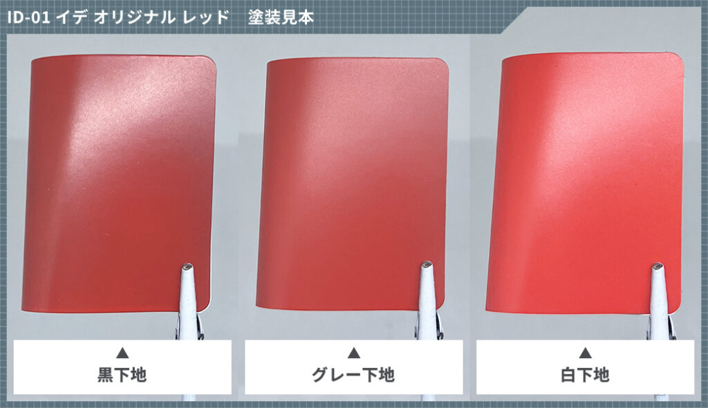 左から黒下地、グレー下地、白下地の順での塗装イメージになります。