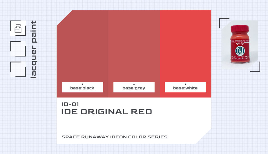 ガイアノーツのラッカー塗料、伝説巨神イデオンカラーシリーズより『ID-01 イデ オリジナル レッド』の塗装イメージ比較確認用カラーチップを作成しました。塗料選定の色見本などにどうぞ。