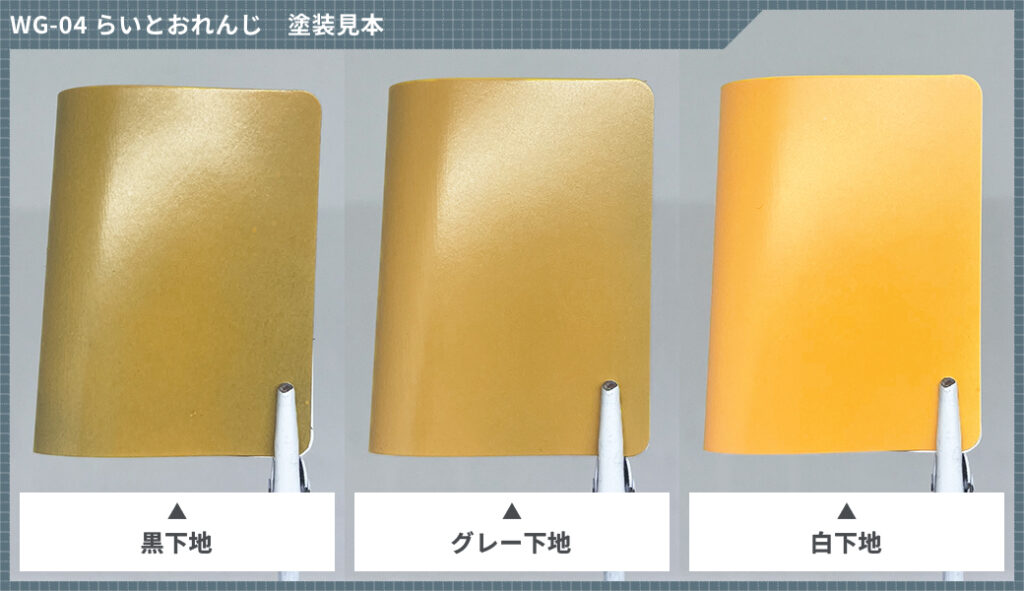 左から黒下地、グレー下地、白下地の順での塗装イメージになります。