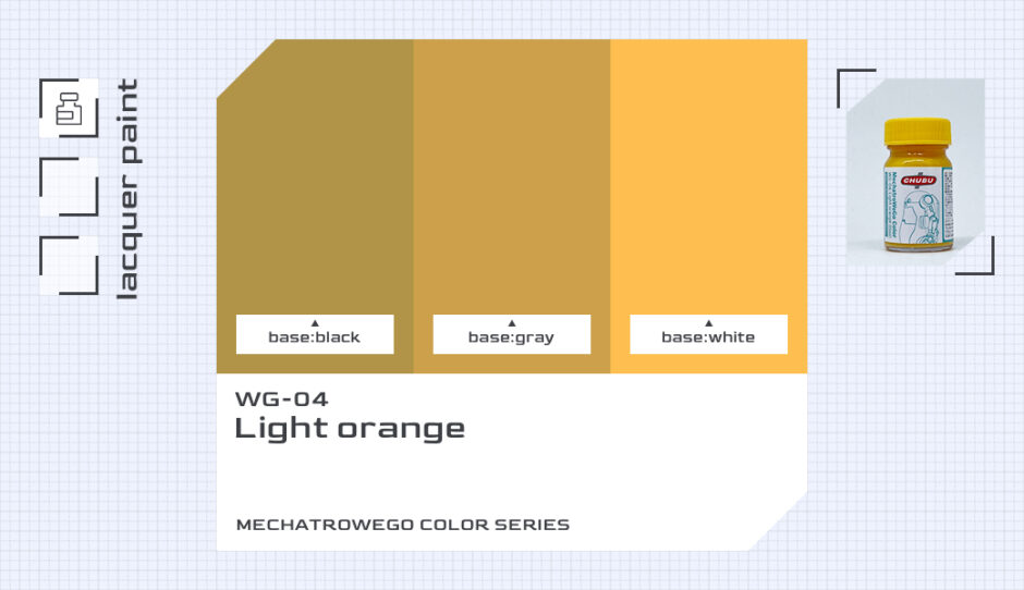 ガイアノーツのラッカー塗料、メカトロウィーゴカラーシリーズより『WG-04 らいとおれんじ』の塗装イメージ比較確認用カラーチップを作成しました。塗料選定の色見本などにどうぞ。