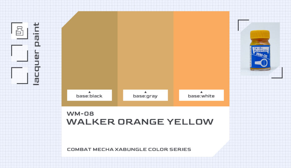 ガイアノーツのラッカー塗料、戦闘メカ ザブングルカラーシリーズより『WM-08 ウォーカーオレンジイエロー』の塗装イメージ比較確認用カラーチップを作成しました。塗料選定の色見本などにどうぞ。