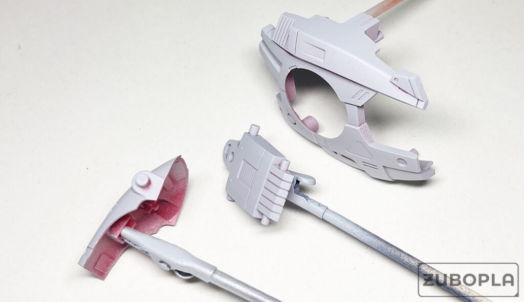 続いて下地塗装。赤いパーツにはクレオスの『Mr.フィニッシング サーフェイサー1500 グレー』を、黒いパーツにはクレオスの『Mr.フィニッシング サーフェイサー1500 ホワイト』をそれぞれ塗装。