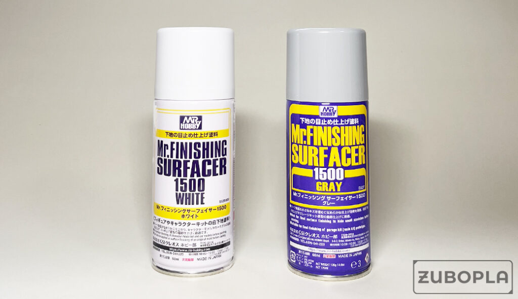 使用したサーフェイサーはクレオスの『Mr.フィニッシング サーフェイサー1500』のホワイトとグレーになります。
