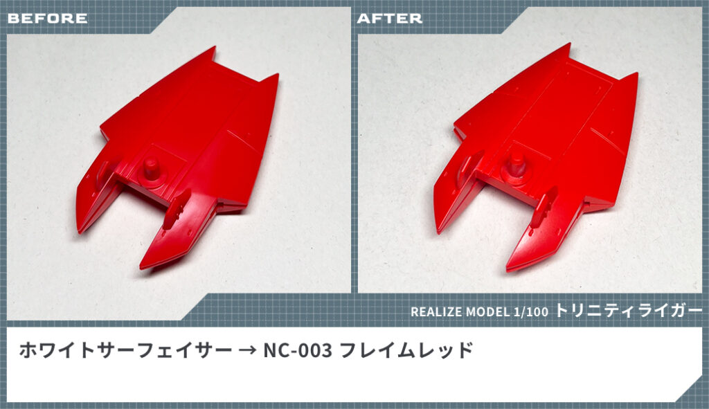 ガイアノーツの瓶入り塗料『NC-003 フレイムレッド』で塗装。塗装の下地にはクレオスの『Mr.フィニッシング サーフェイサー1500 ホワイト』を使っています。